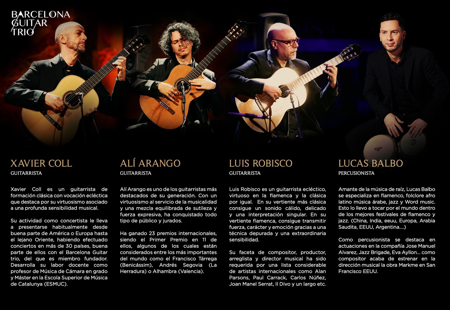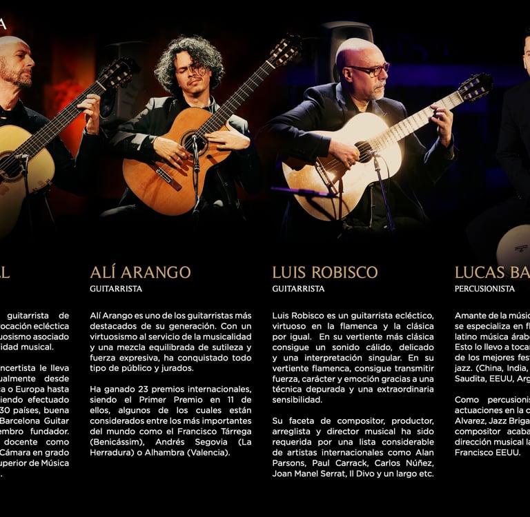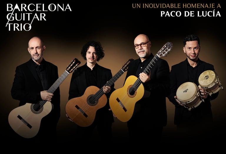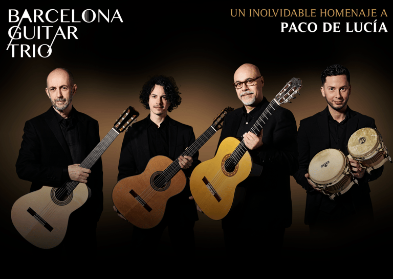 The Barcelona Guitar Trio, featuring virtuosos Alí Arango, Xavier Coll, and Luis Robisco, joined by the dynamic percussionist Lucas Balbo and a pair of brilliant flamenco dancers, delivers an unforgettable homage to the legendary Paco de Lucía. Through a stirring fusion of Spanish and flamenco guitars, they bring to life works by Federico García Lorca, Manuel de Falla, Chick Corea, and Paco de Lucía himself — in awe-inspiring venues like the Palau de la Música Catalana and the Basilica of Santa Maria del Pi. This acclaimed production has moved thousands of audience members worldwide, creating emotional, electrifying performances that blend virtuosic mastery with the deep soul of flamenco.